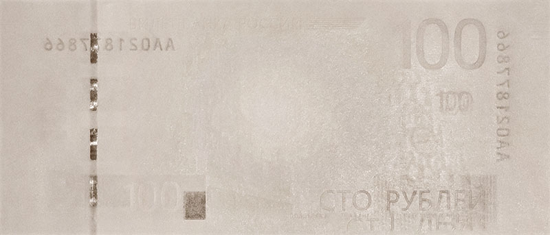 - Комбинированный водяной знак - число "100" и фрагмент Спасской башни, видимые на просвет.