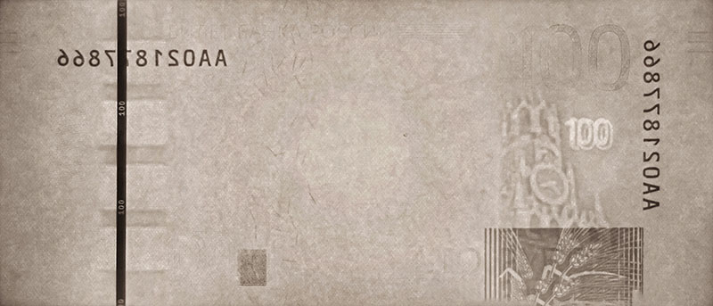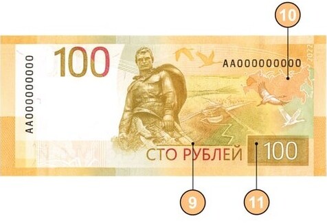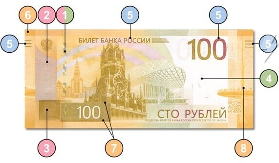 - Для слабовидящих нанесён рельефный номинал «100» и рельефные штрихи по краям банкноты.