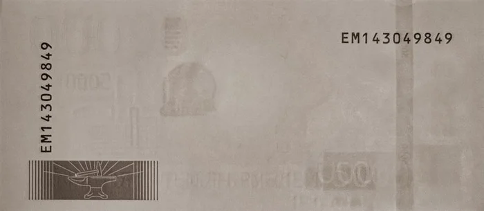 - На просвет виден комбинированный водяной знак - изображение здания Главпочтамта Екатеринбурга и число "5000".
