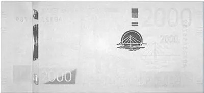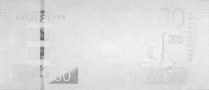 7. В области защитной нити и цифровых обозначений номинала наблюдается магнитная реакция, обеспечивающая автоматическую идентификацию банкноты.