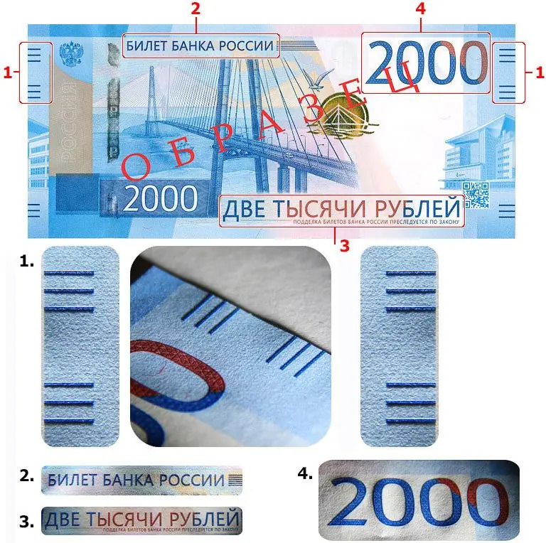 - Рельефные элементы на надписях, номинале, по краям купюры и в области меток для слабовидящих (две короткие выпуклые линии).