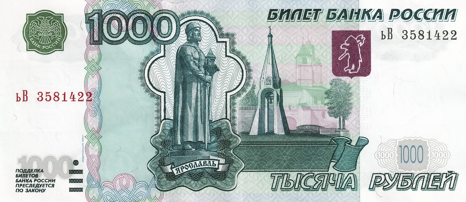 ⮟ Банкнота Банка России образца 1997 года номиналом 1000 рублей модификации 2004 года ⮟