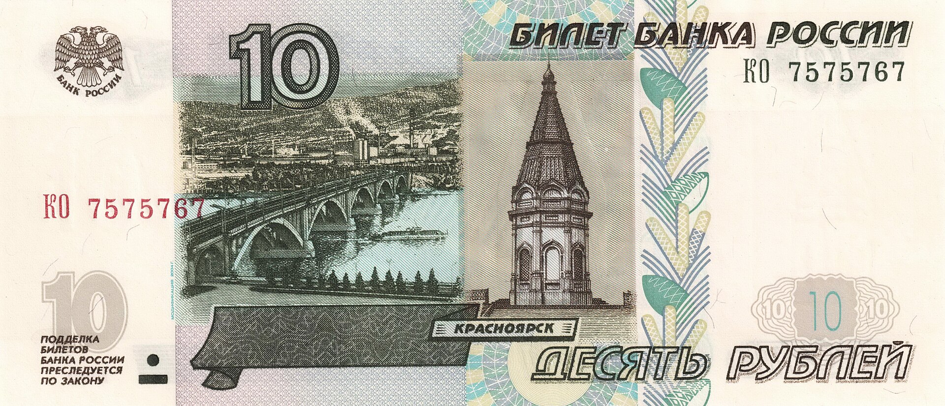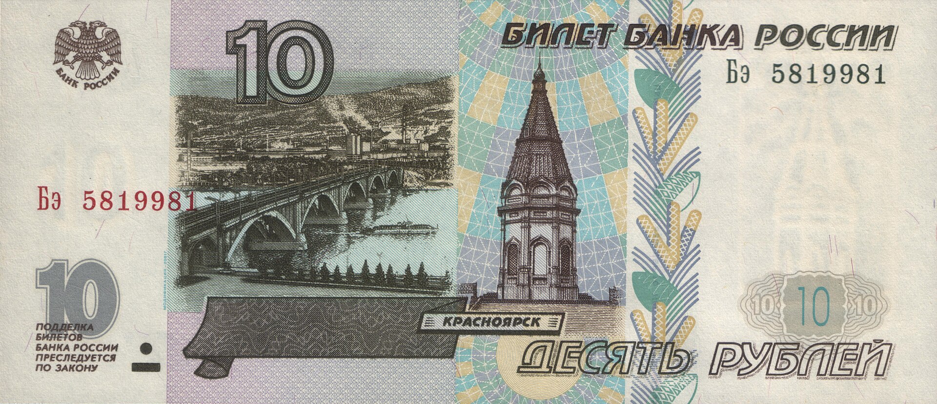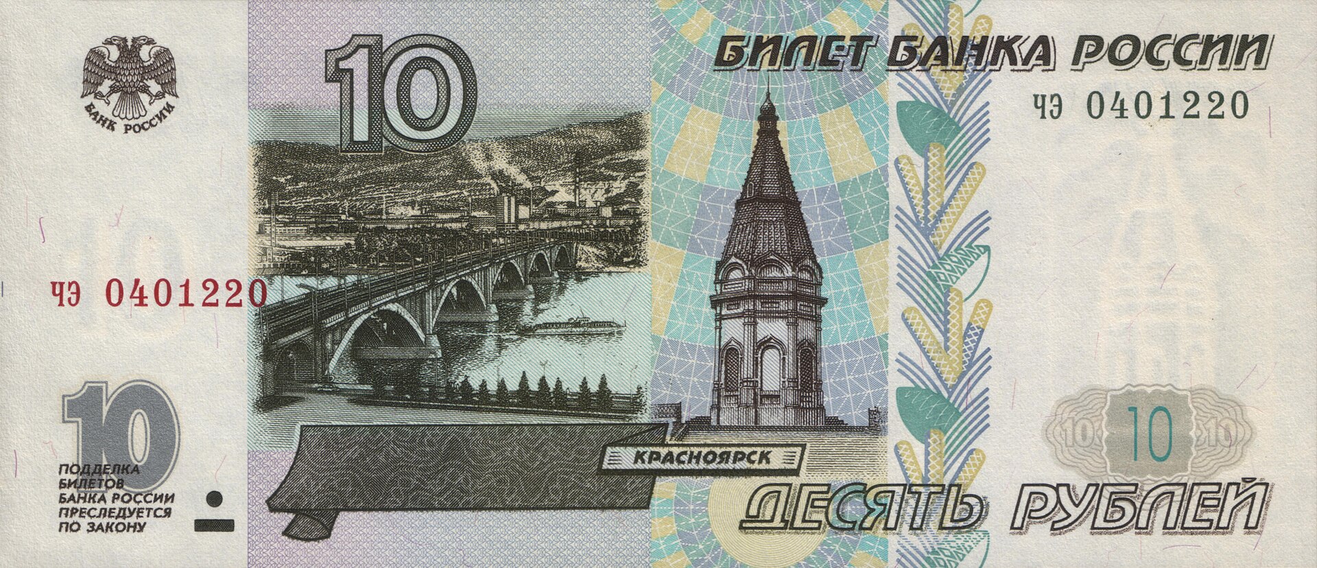 ⮟ Банкнота Банка России образца 1997 года номиналом 10 рублей модификации 2001 года ⮟