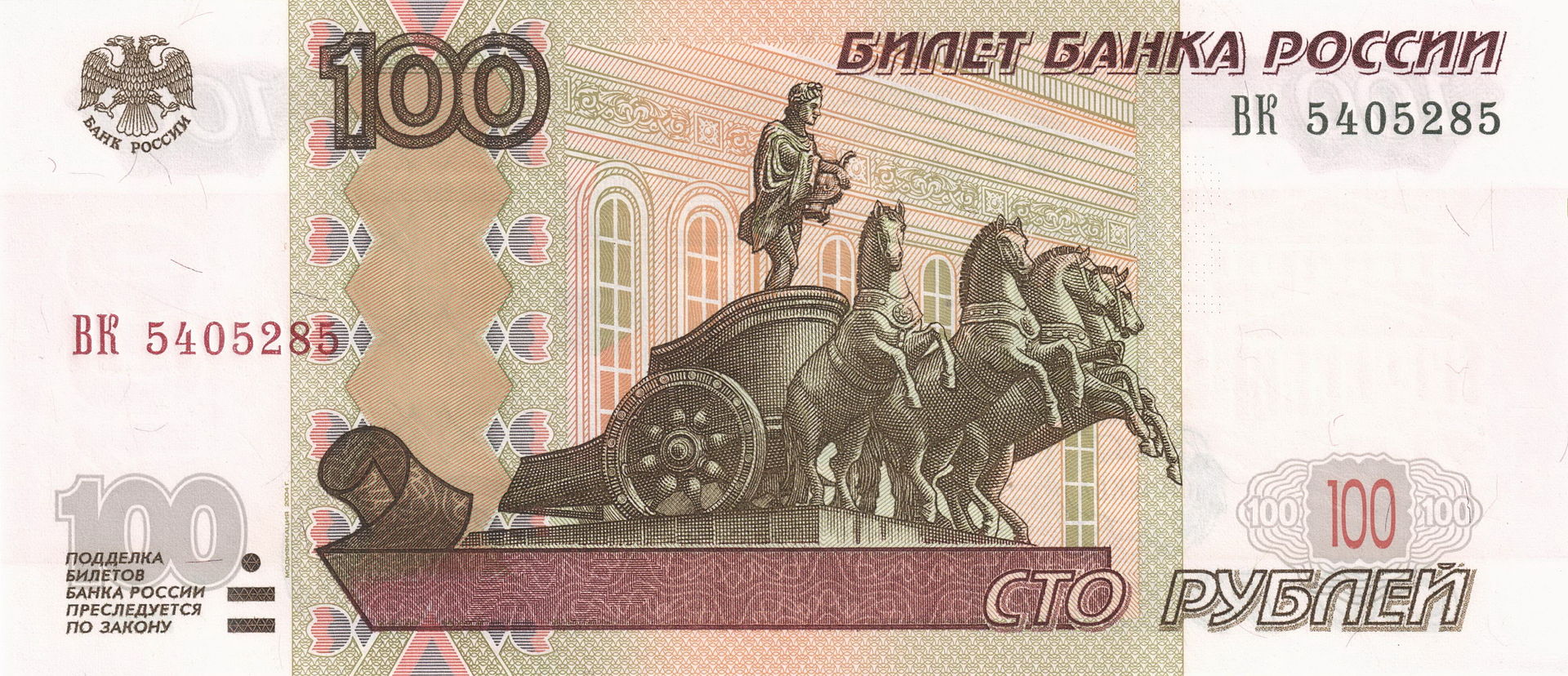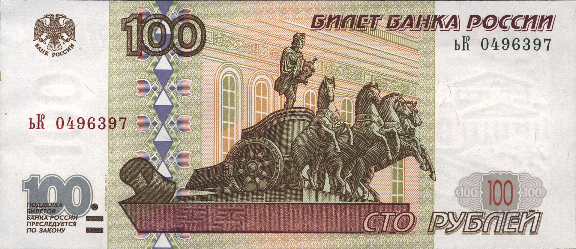 ⮟ Банкнота Банка России образца 1997 года номиналом 100 рублей модификации 2001 года ⮟