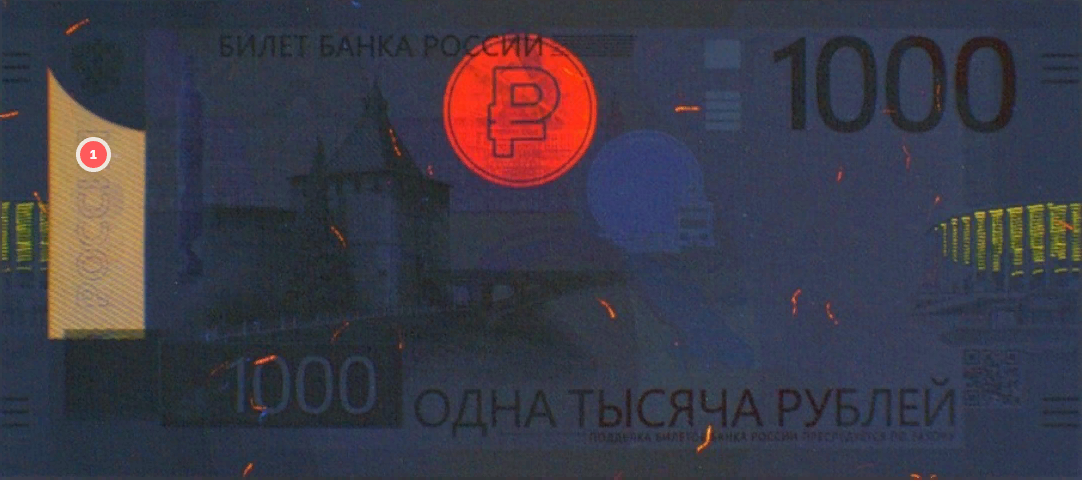 - Применены рельефные элементы: надписи "БИЛЕТ БАНКА РОССИИ", номинал "1000", штрихи по краям купюры и метки для слабовидящих.