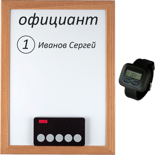 Комплект iBells 1 включает в себя: влагозащищенную кнопку вызова iBells 350, один наручный пейджер официанта iBells 203 и маркерную доску.