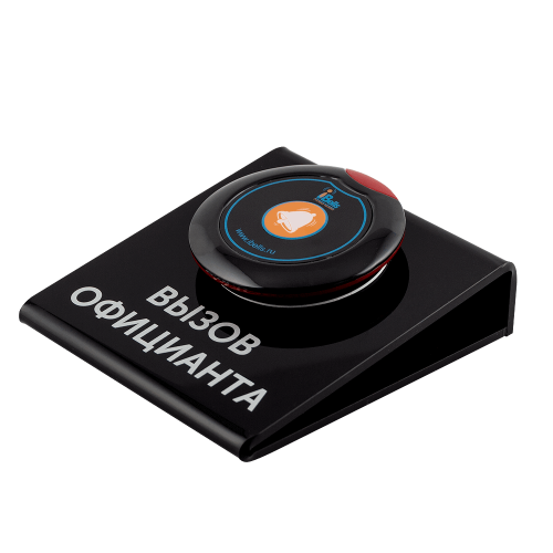 Удобный комплект является частью системы вызова персонала iBells. На подставке предусмотрена надпись, которая помогает гостям понять, что они могут вызвать официанта новым способом.