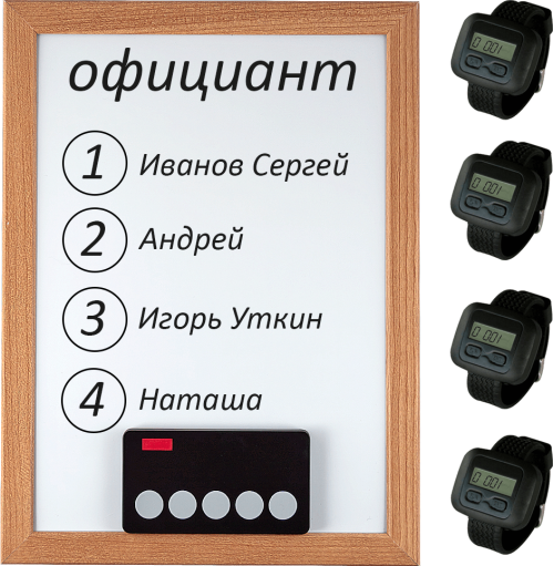 Комплект iBells 4 включает в себя: влагозащищенную кнопку вызова iBells 350, 4 наручных пейджера официанта iBells 203 и маркерную доску.
