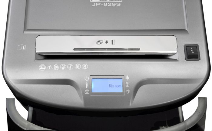 Jinpex JP-829S - это высокопроизводительный уничтожитель, который уничтожает до 22 листов за раз. Отдельное отверстие для уничтожения CD и кредитных карт. JP-829S имеет вместительную корзину на 34 литра, и режет на полоски 4,0 мм, также есть сенсорная панель автоостановки Safe Touch.