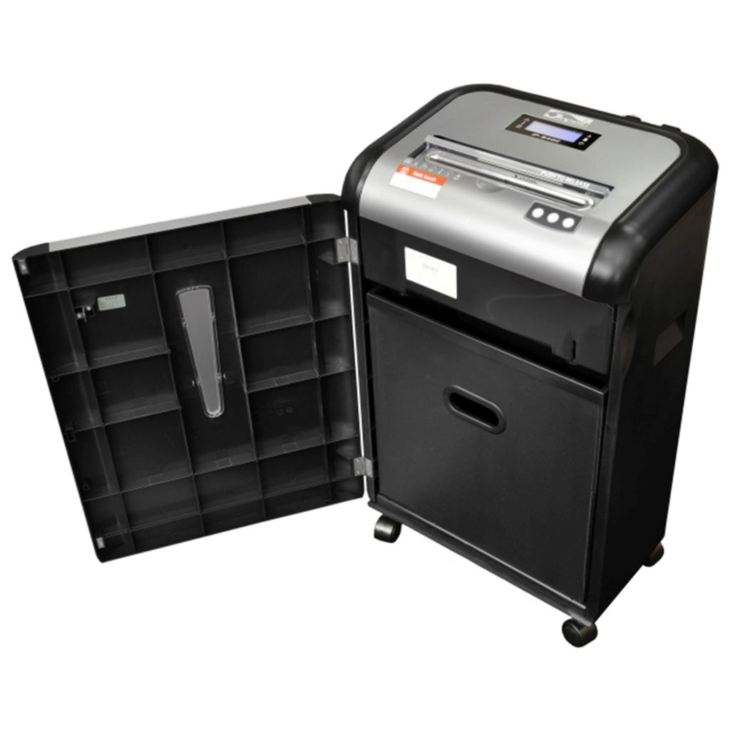 Уничтожитель бумаги Jinpex JP-840C подходит для работы в малых офисах. Данная модель шредера помимо бумаги уничтожает кредитные карты, диски DVD/CD, степлерные скобы, скрепки, есть отдельное отверстие для уничтожения кредитных карт и дисков, закрывающей шторкой. Металлическая сетчатая корзина рассчитана на использование пакета и имеет объем в 26 литров, ролики позволяют легко передвигать уничтожитель. Современный дизайн в черно-серебристом цвете.