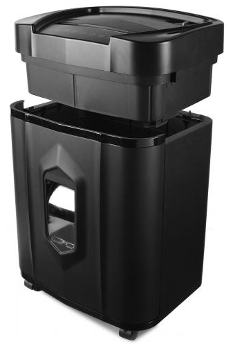 Шредер имеет корзину с удобной ручкой и ролики для передвижения.