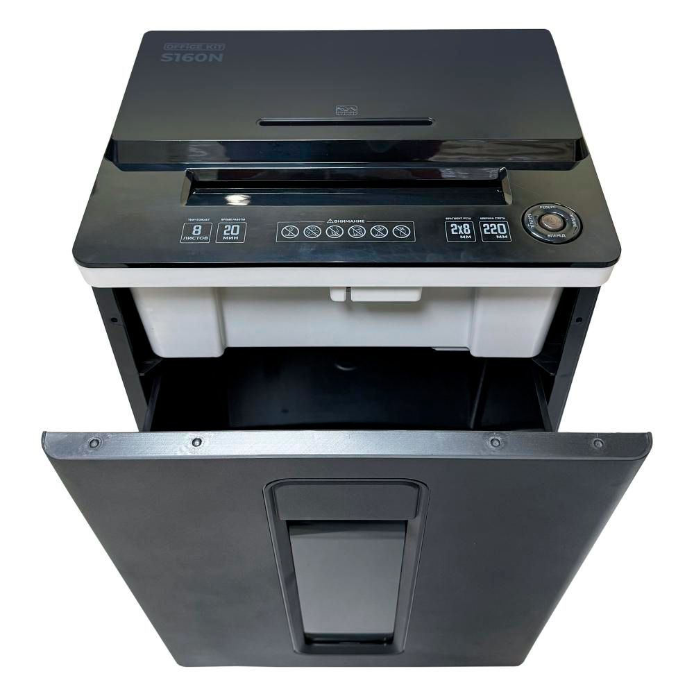 Уничтожитель документов Office Kit S160N 2x8, Тип резки: перекрестная, Размер фрагментов: 2x8 мм, Емкость корзины: 22 л, Защита от перегрева: да, Возможности уничтожения: бумаги, компакт-дисков, кредитных карт, скрепок, степлерных скоб, Гарантия на ножи: 1 год, Гарантия: 1 год