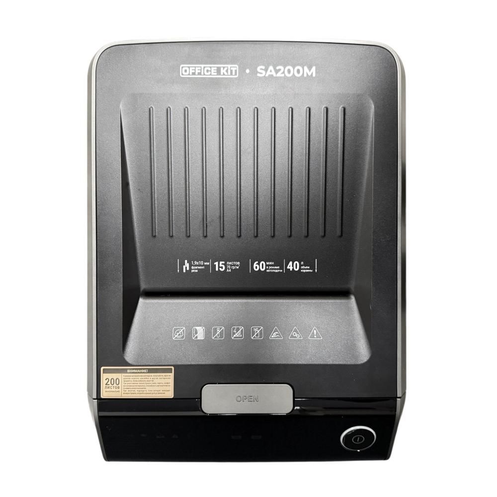 Компактный, эргономичный уничтожитель Office Kit SA200M 1,9x10 для офисного использования с мощным двигателем и АВТОПОДАЧЕЙ до 220 листов, оснащен понятной панелью управления с индикацией: перегрев, открытая крышка автоподачи, полная корзина.